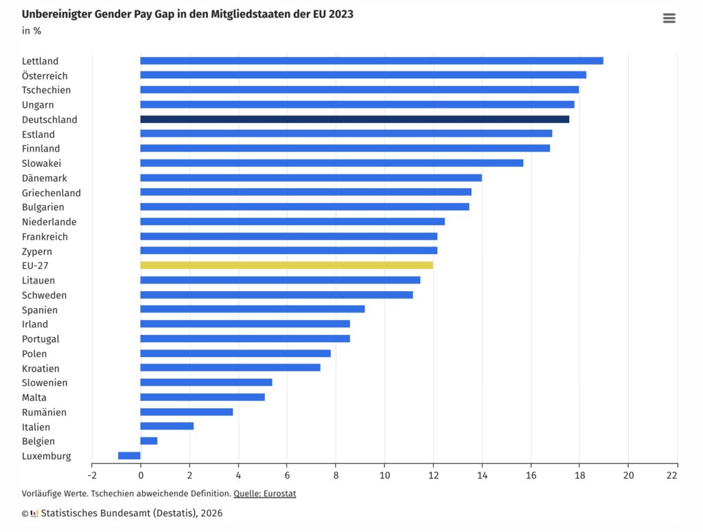 Trotz Fortschritten besteht in Europa, besonders in Deutschland, weiterhin eine Lohnlücke zwischen Männern und Frauen. 2022 betrug der durchschnittliche Gender Pay Gap in der EU 13%, in Deutschland 2024 sogar 15%. Ursachen sind historische Rollenverteilungen, die dazu führen, dass Frauen häufiger in schlechter bezahlten Berufen arbeiten, Erwerbszeiten unterbrechen oder Teilzeitjobs annehmen. Zudem sind Frauen in Führungspositionen unterrepräsentiert und verhandeln Gehälter anders.